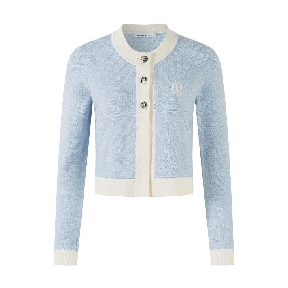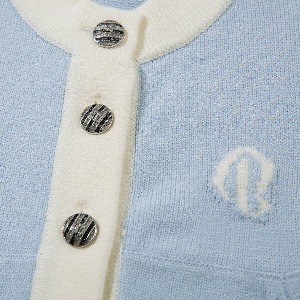 Short Length Long Sleeve Knit Cardigan Color Block Round Neck Buttoned Sweater